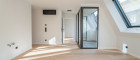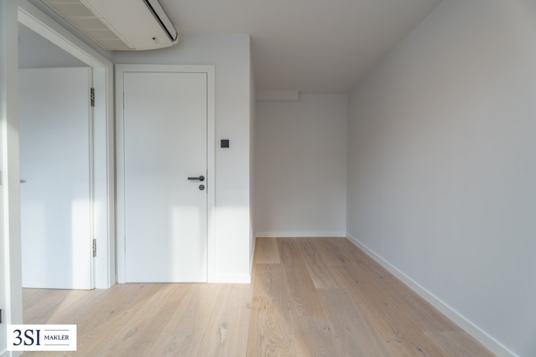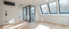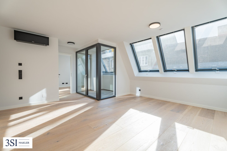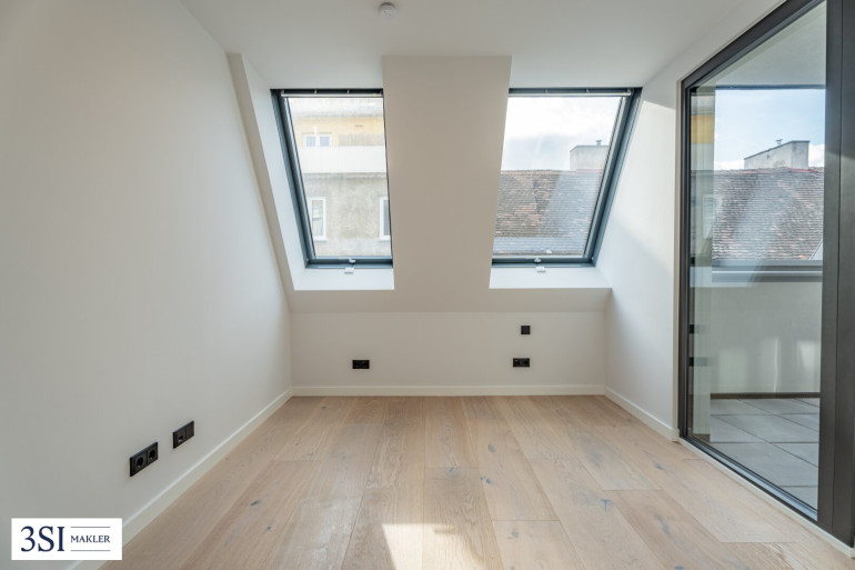 Die Dachgeschosswohnungen – drei Einheiten im 1. Dachgeschoß und das Penthouse im 2. Dachgeschoß – bilden das architektonische Highlight des Projekts. Großzügige Fensterfronten lassen die lichtdurchfluteten Räume erstrahlen und eröffnen eindrucksvolle Ausblicke über die Stadt.