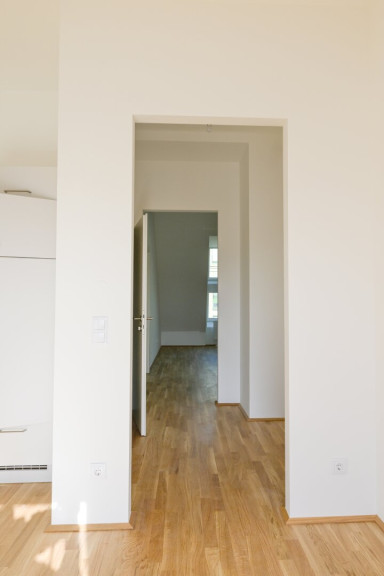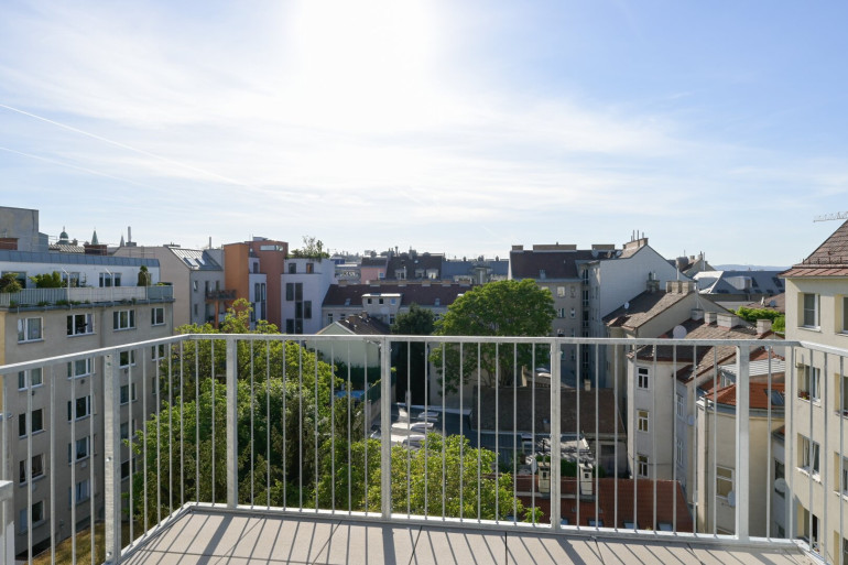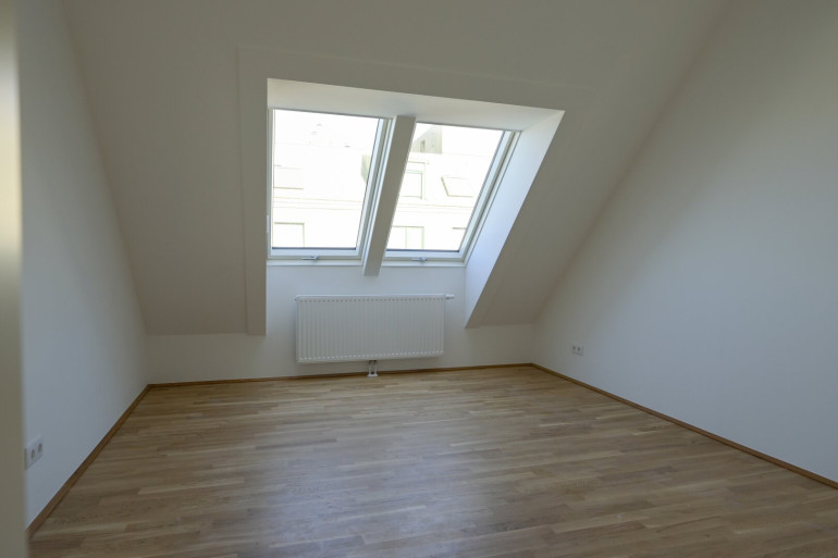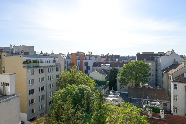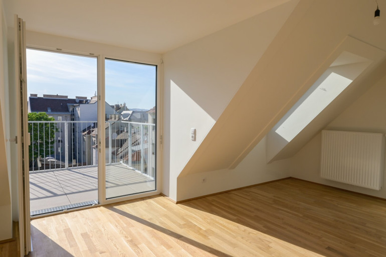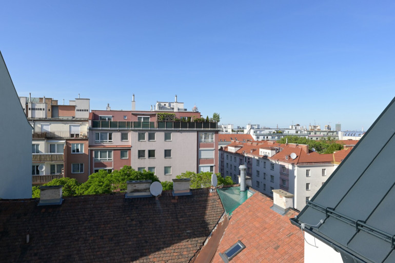 Ideal für Pärchen! Die hier angebotene 2,5-Zimmerwohnung ist 73,49m² groß. Sie besitzt eine sehr schöne Wohnküche mit Essplatz und Ausgang auf die ruhige, westseitig gelegene Hofterrasse. Von hier aus hat man einen schönen Ausblick bis zum Wienerwald. Über einen praktischen Verbindungsgang, vorbei an Gäste-WC und großer Schranknische, gelangt man schließlich in das geräumige Wohnzimmer. Ein helles Schlafzimmer mit großen Dachfenstern schließt unmittelbar daran an und bietet direkten Zugang zum eignen Wannen-Bad.