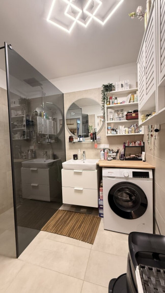 Das Bad ist mit einer bodenebenen Dusche mit Rainshower und Feinsteinzeugfliesen ausgestattet. Das Badezimmer und WC sind auch sauber verfliest und modern verglast.