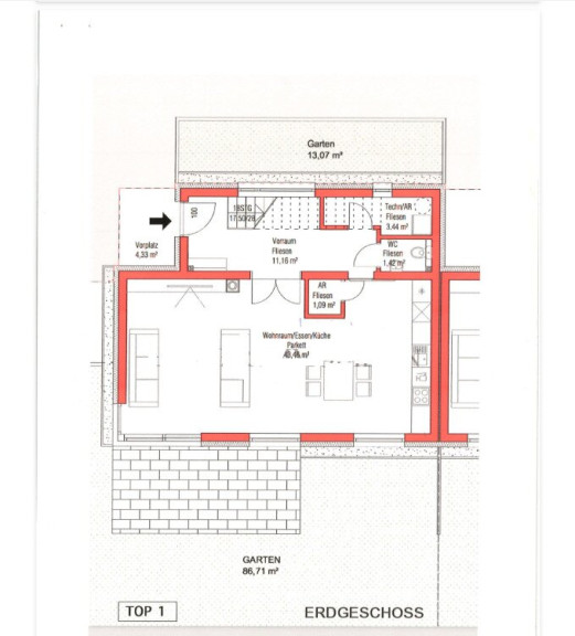 EG: offener Wohn-Essbereich-Küche, Vorraum, WC, Technikraum und Abstellraum