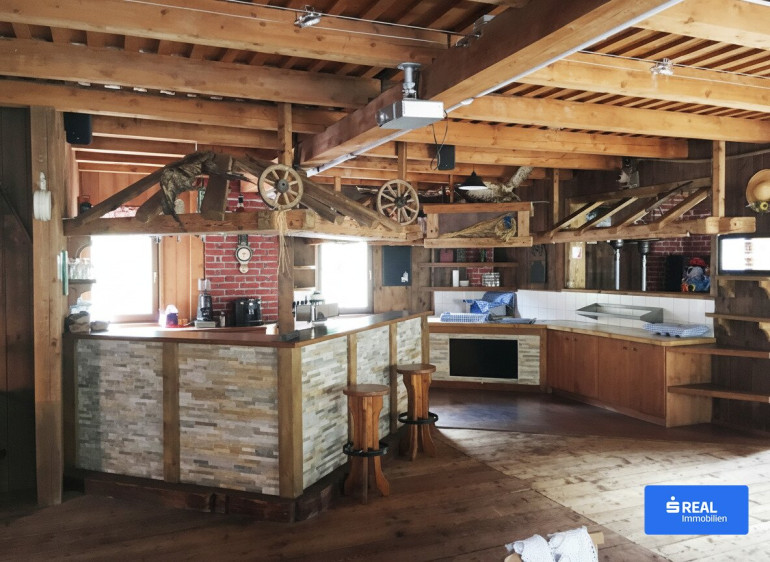 Ein Stockwerk darüber entfaltet sich das kulinarische Herz des Hauses: Eine voll ausgestattete Küche trifft auf einen einladenden Gastraum mit rund 60 Sitzplätzen – ideal für ein Restaurant, ein Eventcafé oder auch als Gemeinschaftsbereich bei Seminaren und Retreats. Die westseitig angegliederte Spielhalle lässt sich ebenso kreativ nutzen – sei es als Indoor-Freizeitbereich, Galerie oder Co-Working-Space.