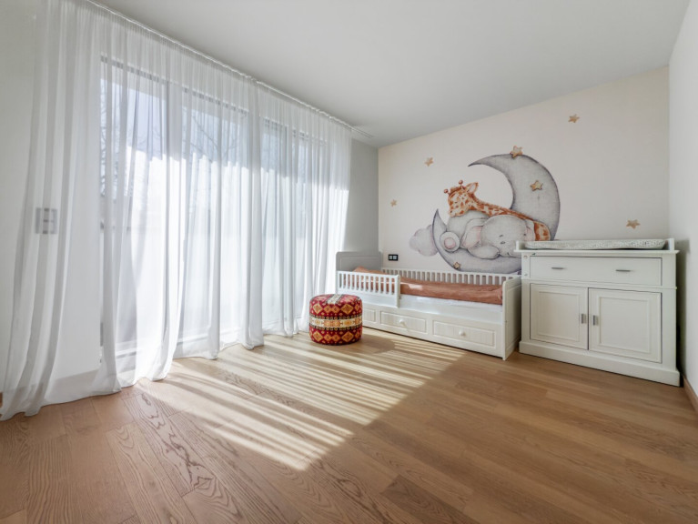 Das Obergeschoss beherbergt drei Master-Suiten, jeweils mit eigenem Badezimmer, Schrankraum und Zugang zu Terrassen oder Balkonflächen. Die wohldurchdachte Raumplanung ermöglicht flexible Nutzung – ob als Familienebene, Gästetrakt oder für den individuellen Lebensstil. Ein charmantes Detail: Das Baumhaus mit Holzbrücke – ein architektonisches Augenzwinkern, das Jung und Alt begeistert.