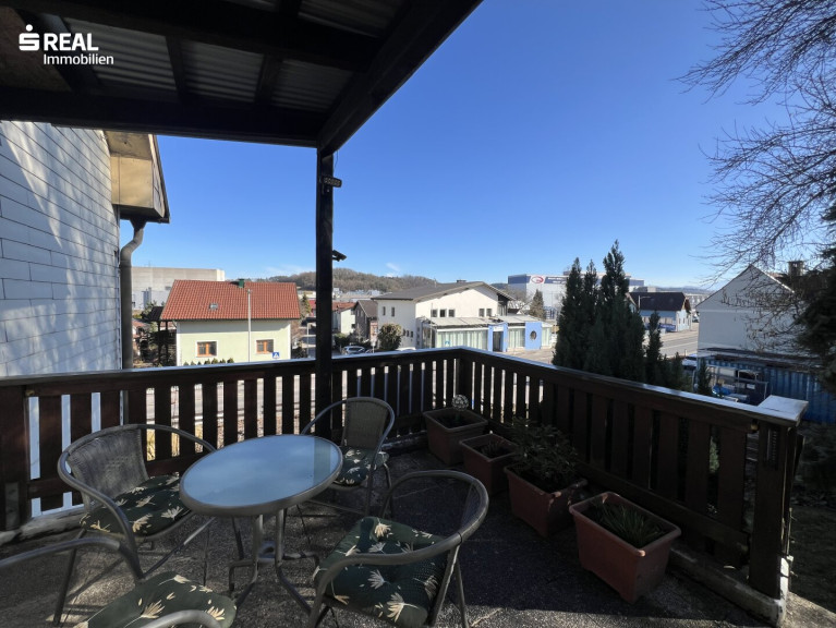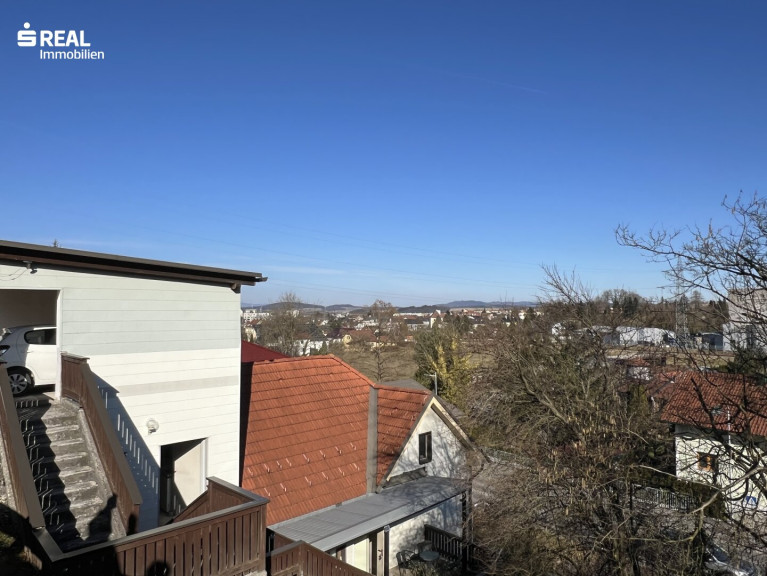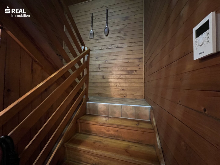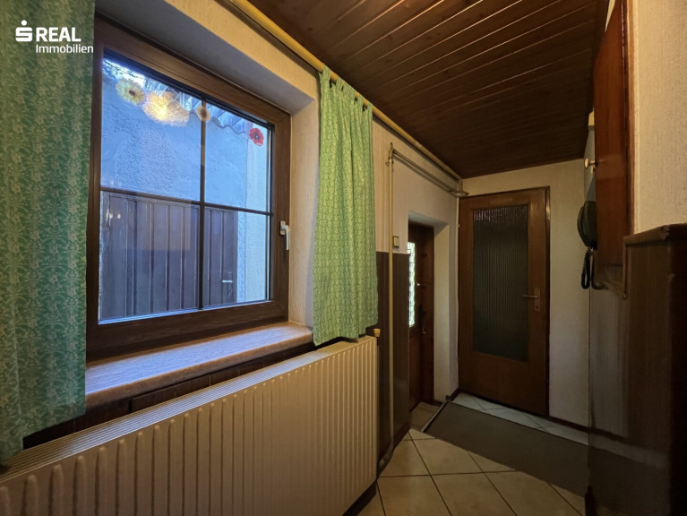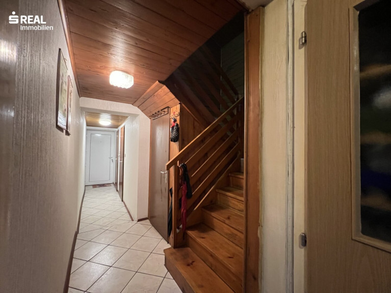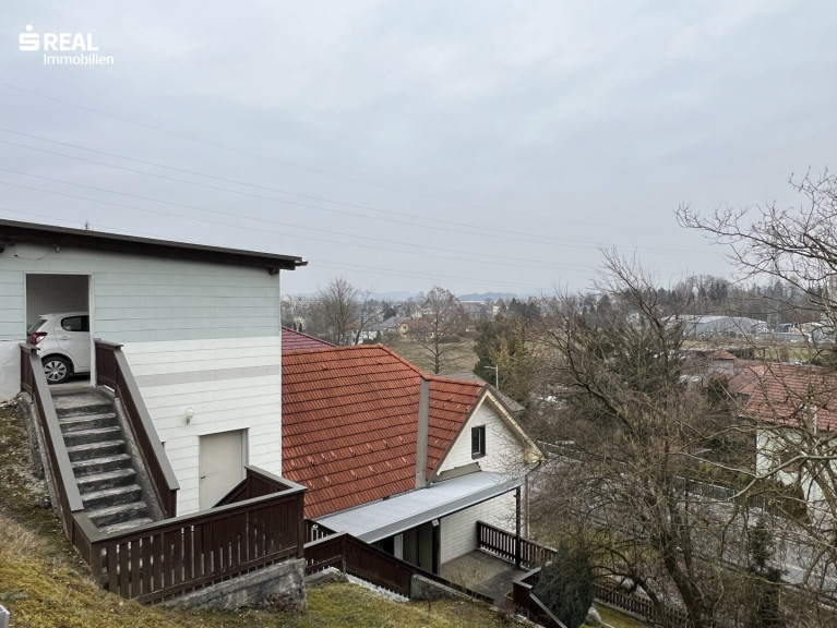 Das Haus liegt zentral in einer steilen Hanglage mit zwei Zugängen, wobei der Hauptzugang über die Schulstraße erfolgt, wo man auch bequem im eigenen Carport parken kann. Von dort gelangt man über die betonierte Außentreppe ins Wohnhaus.