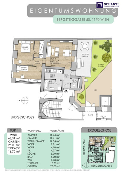 + TOP 1 / EG: Wohnfläche: ca. 66,51m² + Terrasse: ca. 16,70m² + Garten: ca. 26m² / 3 Zimmer / € 399.000.-