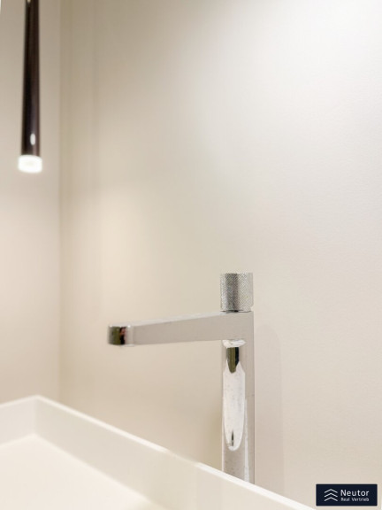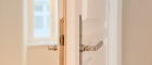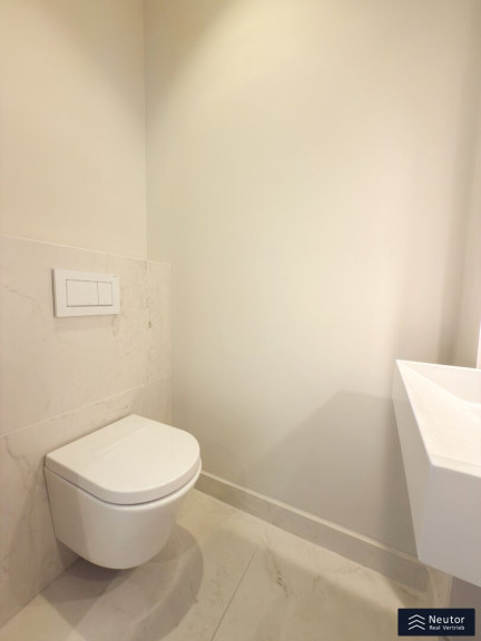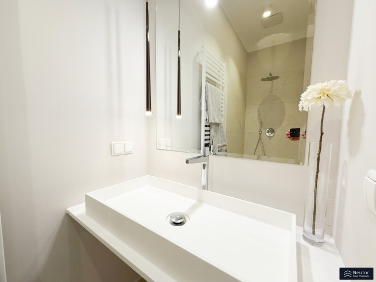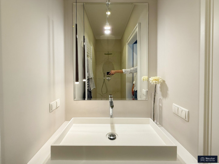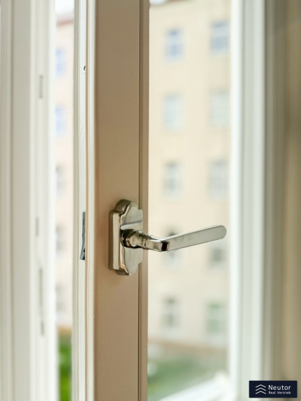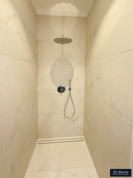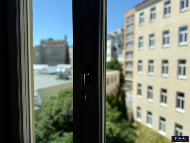 Das Badezimmer ist ein kleines Paradies: Eine stilvolle Dusche, umgeben von großflächigen, hochwertigen Fliesen, lädt zum Entspannen ein, während das separate WC mit Handwaschbecken den Alltag praktisch und elegant ergänzt. Beide Nassräume strahlen in luxuriösem Glanz und vereinen Funktionalität mit Ästhetik. Drei-fach-Isolationsfenster im klassischen Altwiener Stil rahmen die Welt draußen ein, halten die Wohnung warm und die Stadtgeräusche fern. Und für den perfekten Komfort? Eine clevere Nische verbirgt den Waschmaschinenanschluss und die Therme, sodass nichts die harmonische Optik stört.