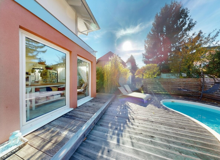 Auf einer Grundfläche von ca. 746m² in Floridsdorfer Ruhelage befinden sich diese zwei Häuser – ein Einfamilienhaus aus dem Baujahr 2007 (Holzriegelbauweise) und ein Nebenrefugium mit ca. 66m² Wohnfläche im Erdgeschoß und einem ausgebauten Dachboden.