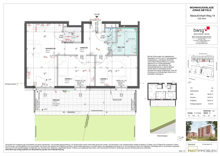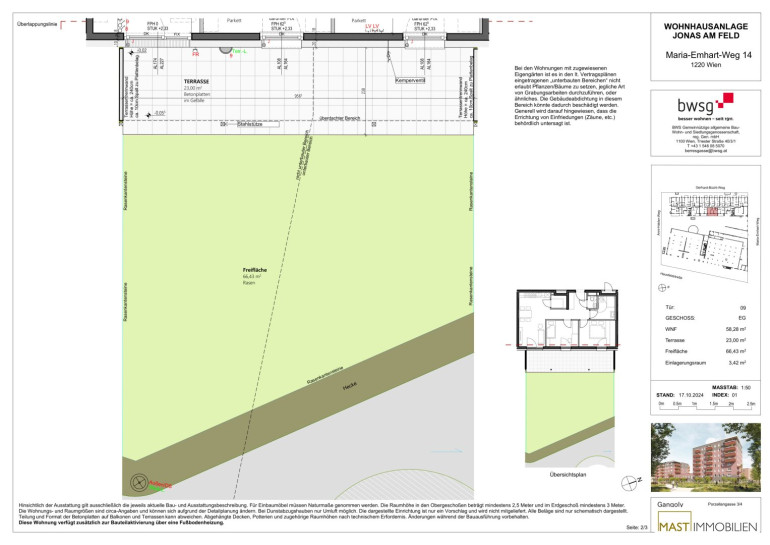 Die Wohnung befindet sich im EG und verfügt über 58,28 m² Wohnfläche + eine 66,43 m² große Freifläche + 23 m² große Terrasse