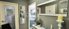 Der große Wohnraum, aktuell als Praxis genutzt, bildet das Herzstück des Erdgeschosses. Hier treffen Hochglanzlaminat, klare Formen und moderne Materialien auf einen elektrischen Kamin mit indirekter Beleuchtung, der für eine stimmungsvolle Atmosphäre sorgt – perfekt für entspannte Abende oder als repräsentativer Empfangsbereich. Die Küche ist funktional und offen gestaltet, ideal in das Wohnkonzept integriert. Ein separates WC rundet die untere Ebene ab.