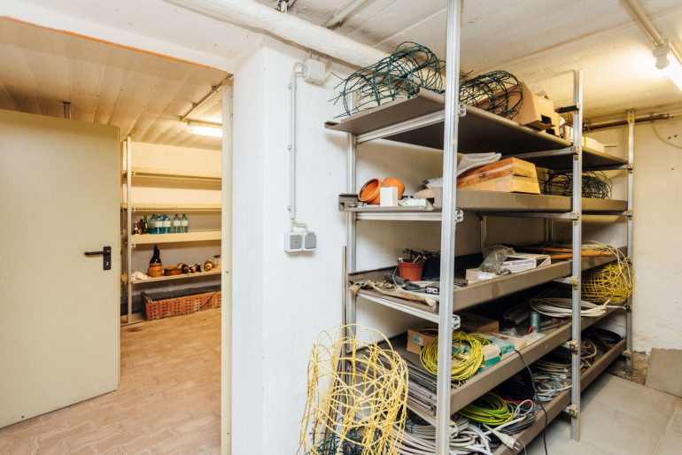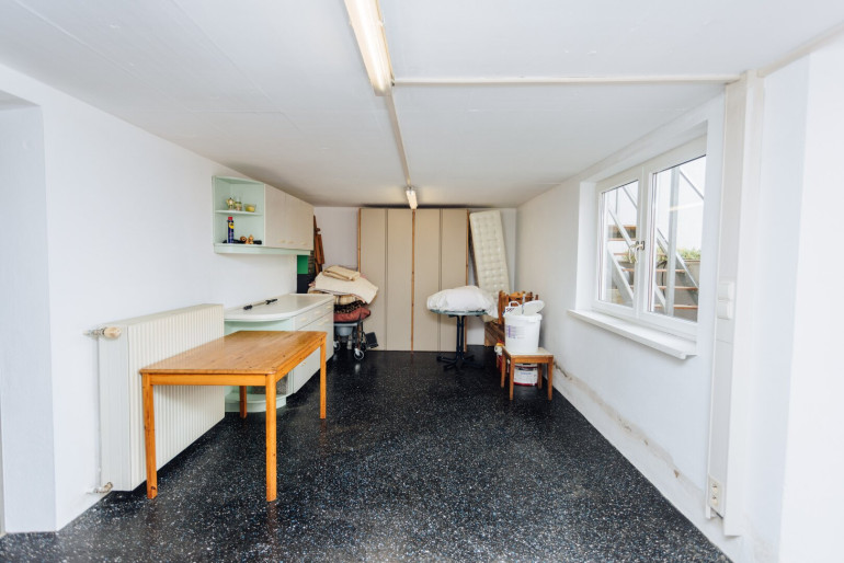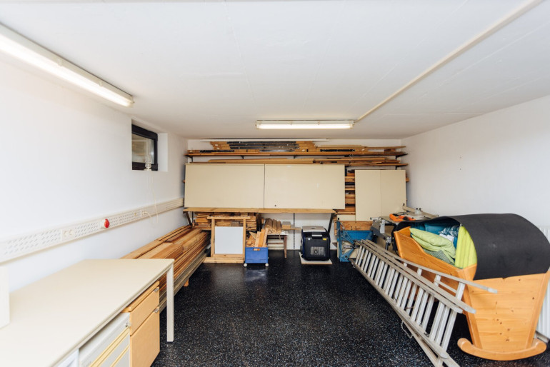 Vorraum, Technikraum mit integriertem Wirtschaftsraum, WC, zwei Lagerräume, eine Werkstatt mit Ausgang nach draußen und zwei große Hobbyräume mit Zugang zum Garten.