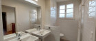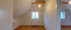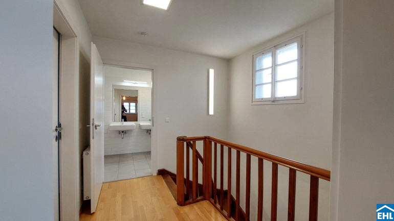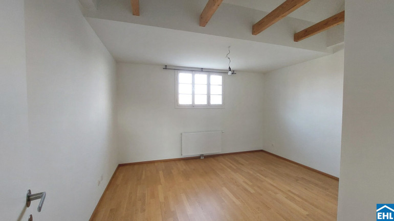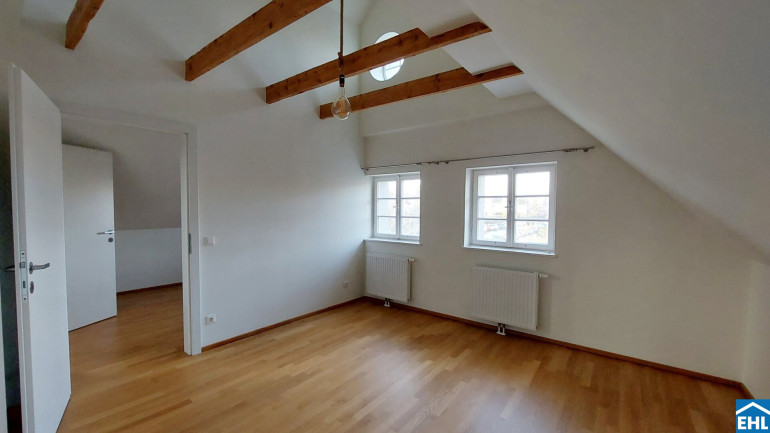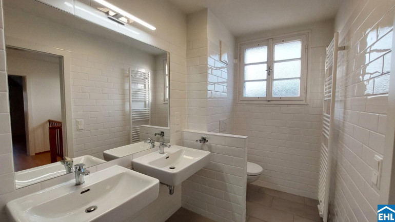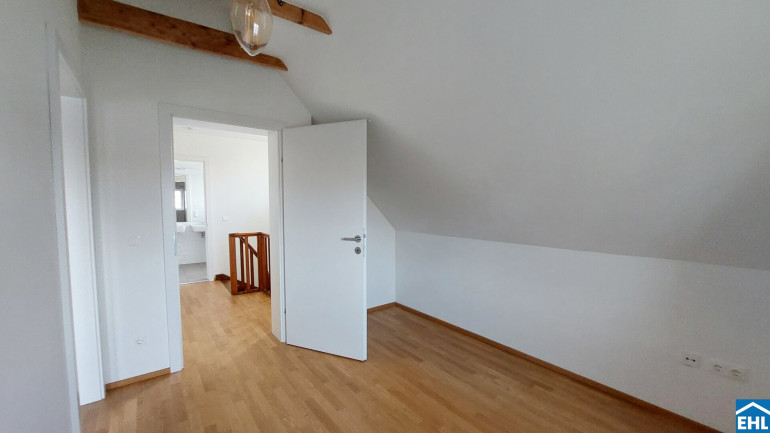 Im 1. Obergeschoß befinden sich drei Schlafzimmer (eines davon als Durchgangszimmer ausgeführt) mit charmanten Dachbalken, sowie ein Badezimmer mit Badewanne, Doppelwaschbecken und WC.