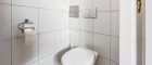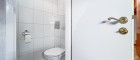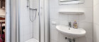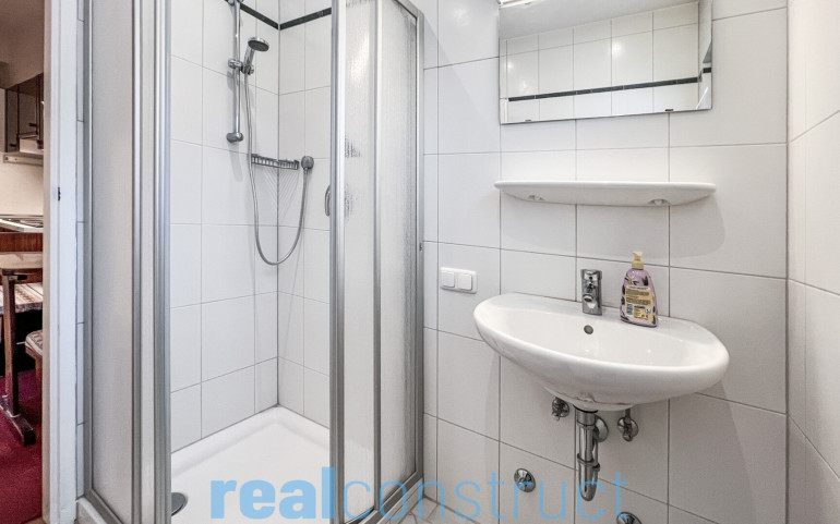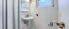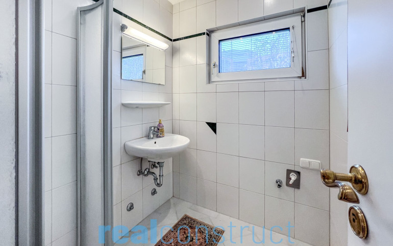 - Badezimmer mit Dusche, Waschtisch und Waschmaschinenanschluss