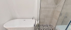 Badezimmer – hochwertig ausgestattet mit freistehender Badewanne, Dusche und Handwaschbecken