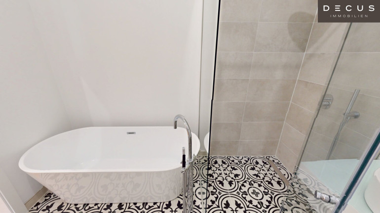 Das edle Fischgrätparkett unterstreicht den klassischen Altbaucharme, während die zeitgemäßen Sanitärelemente und stilvollen Oberflächen ein gehobenes, modernes Wohnambiente schaffen.