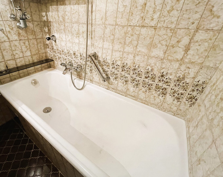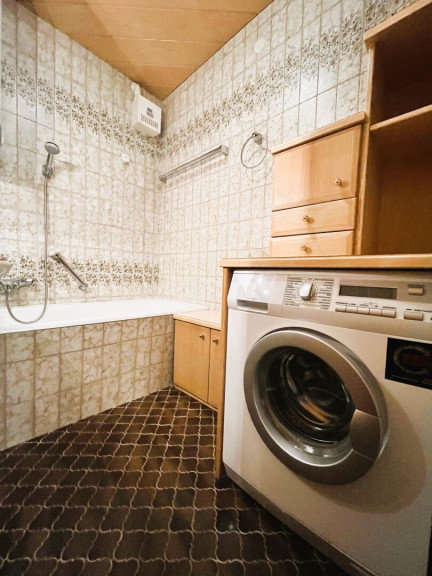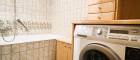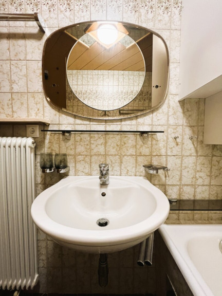 - Badezimmer mit Badewanne, Waschbecken und Waschmaschinenanschluss