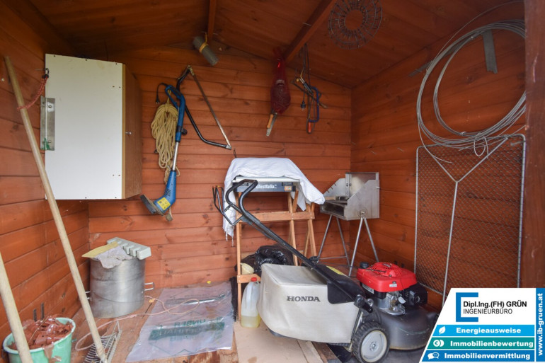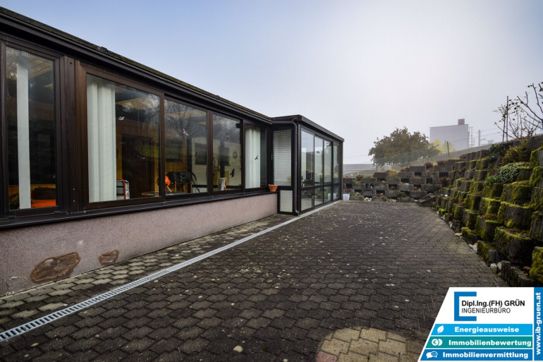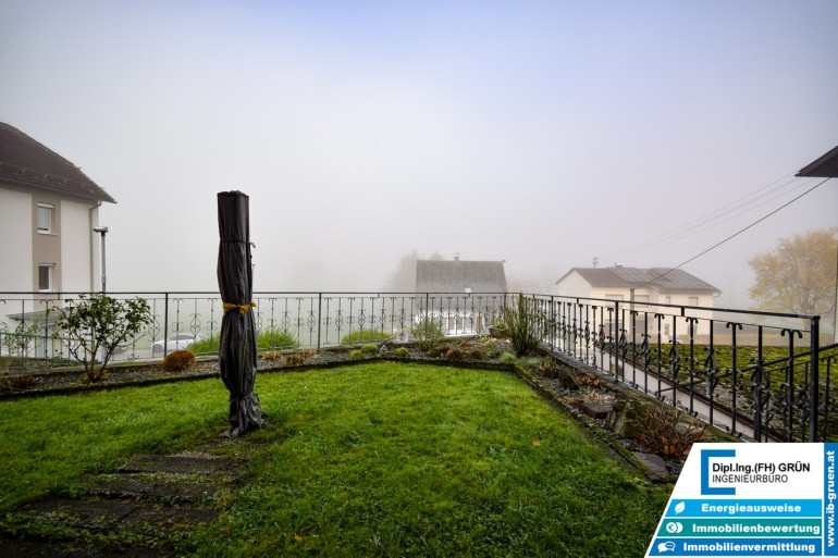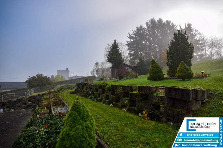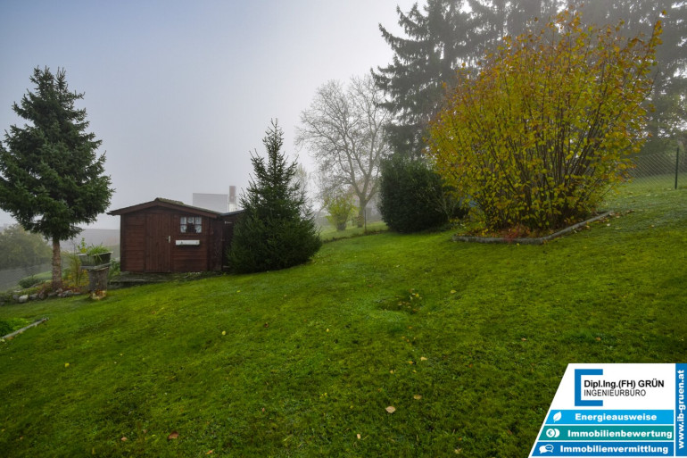 Im Außenbereich erwartet Sie viel Grün, eine sonnige Terrasse sowie eine Fertiggarage mit Platz für zwei Autos.