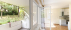 Der zentrale Wohnbereich bietet ausreichend Platz für gemeinsames Leben – ob beim Essen, Spielen oder Entspannen. Große Fensterflächen lassen viel Licht herein und eröffnen den Blick in den begrünten Innenbereich – ohne direktes vis-à-vis.