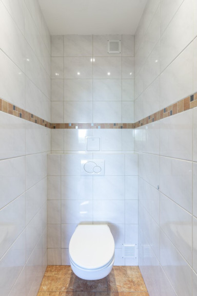 Das Badezimmer ist sowohl vom Flur als auch direkt vom Schlafzimmer aus zugänglich und verfügt über einen Waschmaschinenanschluss. Das separate WC sorgt für zusätzlichen Komfort im Alltag. Ein Abstellraum innerhalb der Wohnung ergänzt das praktische Raumangebot.