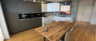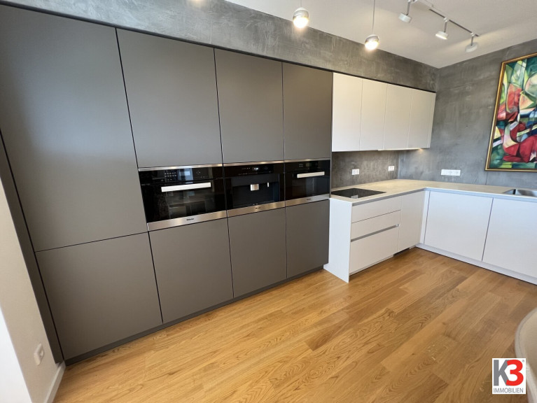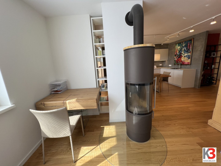 Das Herzstück dieser Immobile ist sicher der offene Koch-, Wohn-, Essbereich mit direktem Zugang zum Balkon. Die moderne, hochwertige Einbauküche bietet Highlights ohne Ende. Der großzügige Essbereich verspricht Gemütlichkeit pur. Der kuschlige Wohnbereich wird von einem schwenkbaren Kaminofen mit behaglicher Wärme versorgt.