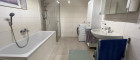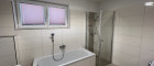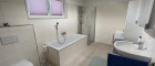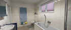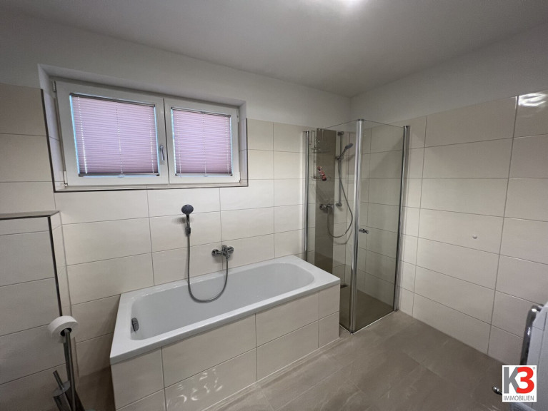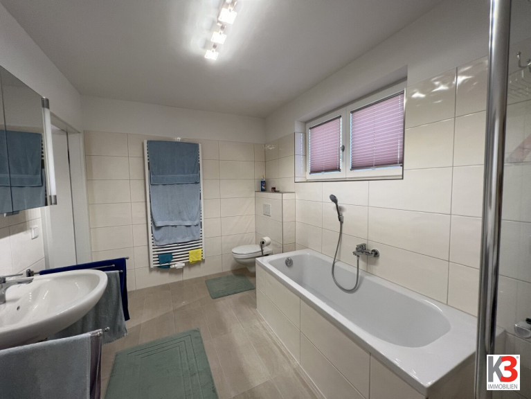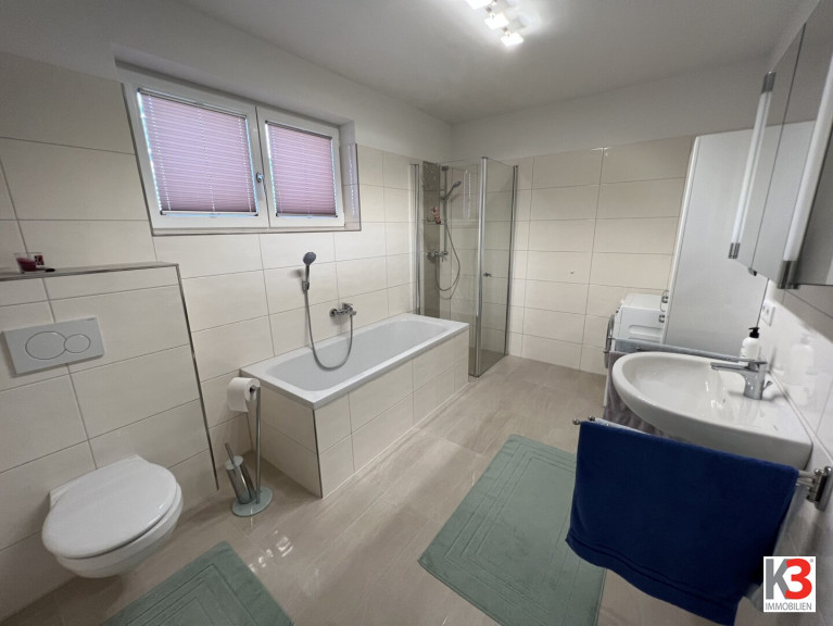 Das Badezimmer mit Tageslicht, Badewanne und Dusche besticht vor allem durch das sehr geschmackvolle Ambiente und seine Größe.