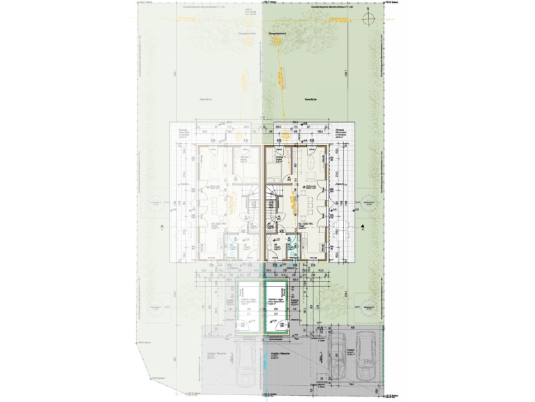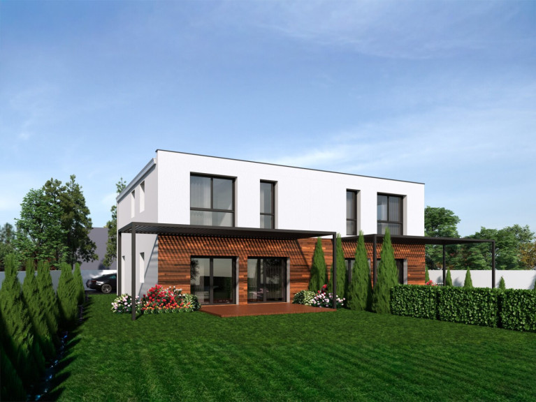 Die ca. 117 m² Wohnfläche verteilt sich auf zwei Ebenen. Durch das offene, überdachte Eingangsportal gelangen Sie in den Innenbereich der Anlage. Im Erdgeschoss gibt es einen hellen Eingangsbereich, einen offenen Wohn- und Essbereich mit einem leicht abgetrennten Küchenblock, ein Schlafzimmer oder Büro und ein Gäste WC. Durch die bodentiefen Fenster wirkt der Raum sehr hell und freundlich. Vom Wohnbereich gibt es einen fließenden Übergang zur sonnigen Terrasse und dem Garten. Das Obergeschoss gliedert sich in drei großzügig geplante Schlafzimmer und ein Badezimmer mit WC und Dusche. Der ca. 10m² große Technikraum/Lagerraum ist länglich vor dem Eingangsbereich angeordnet und bietet dadurch optimale Privatsphäre zum Nachbargebäude.