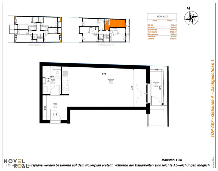 Diese Dachgeschoss-Wohnung überzeugt durch eine kompakte und zugleich funktionale Raumaufteilung. Der Vorraum bietet einen angenehmen Empfangsbereich mit Platz für Garderobe und Stauraum. Die Wohnküche ist offen gestaltet und schafft eine helle, einladende Atmosphäre für gemeinsames Kochen und Wohnen. Das Badezimmer mit WC ist modern ausgestattet und sorgt für Komfort im Alltag. Die Dachterrasse erweitert den Wohnraum ins Freie und bietet einen geschützten Platz zum Entspannen – ideal für ruhige Stunden oder den Start in den Tag.