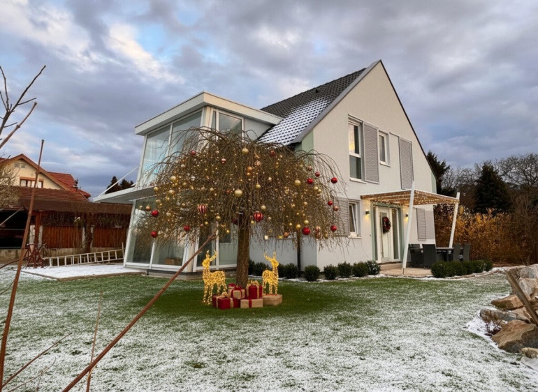 Bei dem Einfamilienhaus handelt es sich um ein Fertigteilhaus der Firma ELK, das ursprünglich als Musterhaus in der Blauen Lagune in Vösendorf stand.