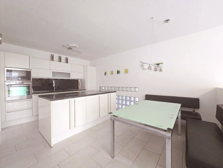 + Wohn/Ess/Küche 47,00 m², Zugang zur Terasse und Garten - moderne Küche mit Kocheninsel, Essplatz und neuwertigen AEG und Siemens Geräten ausgestattet