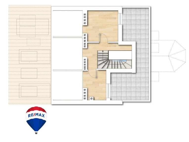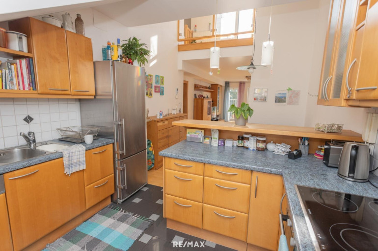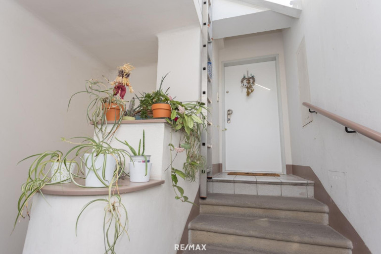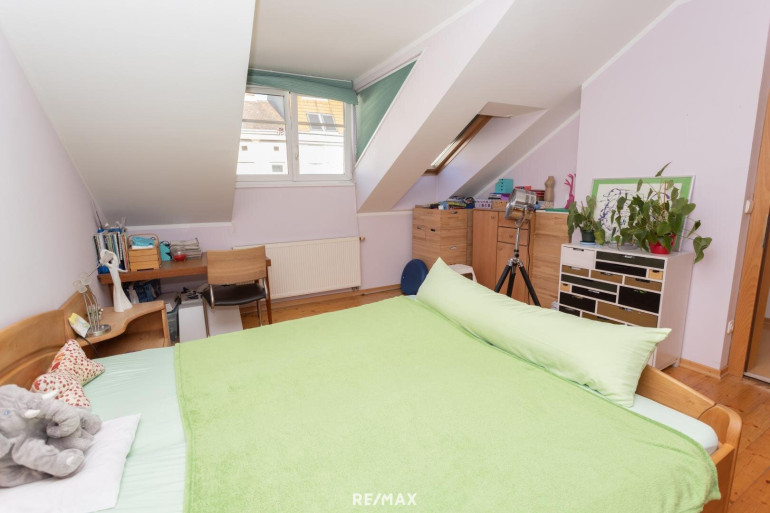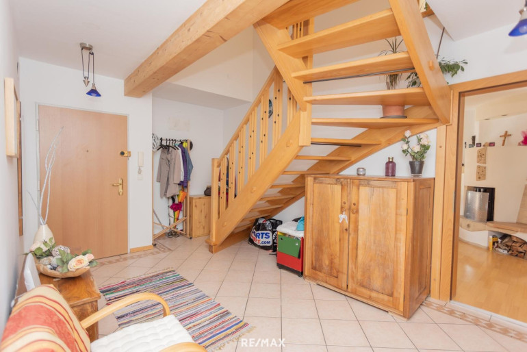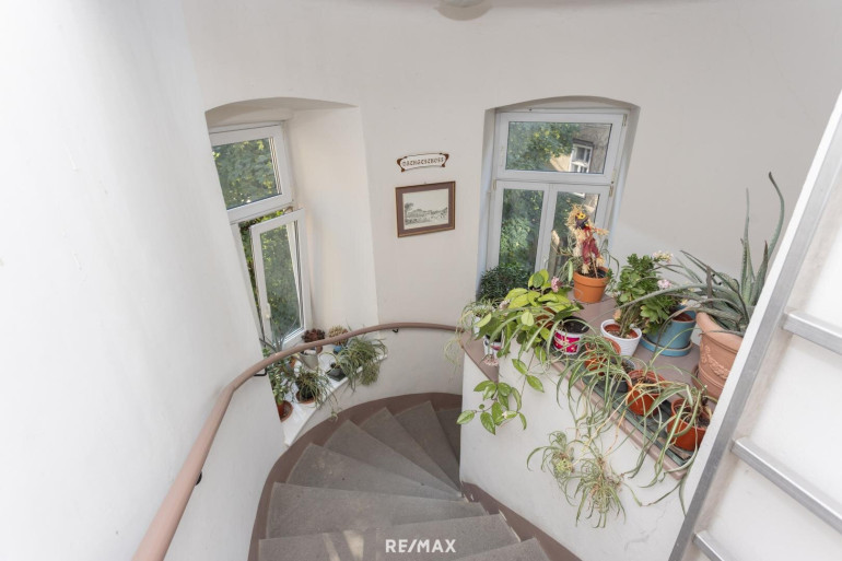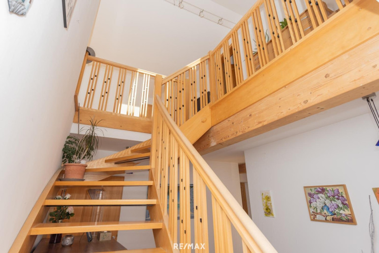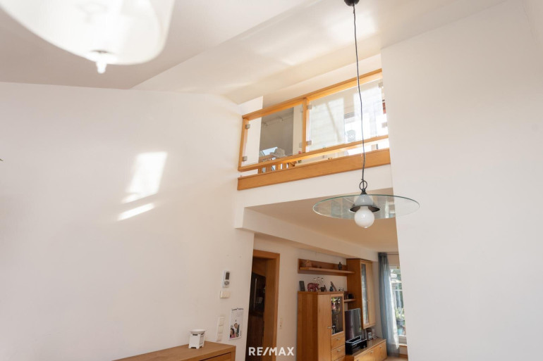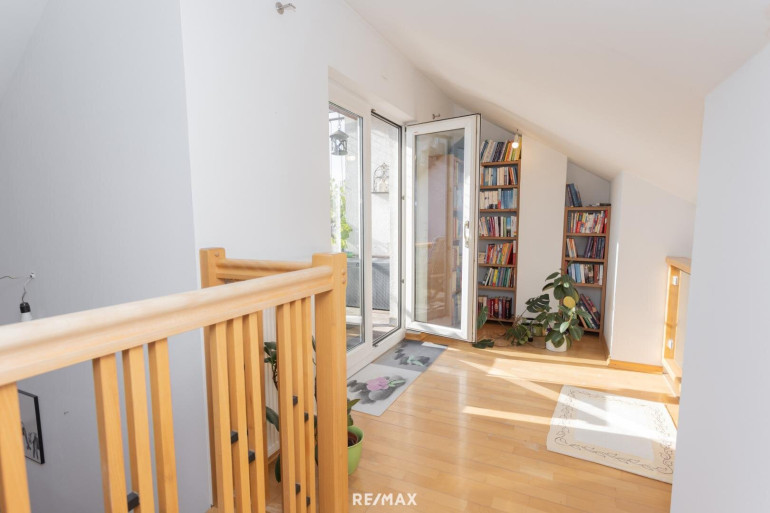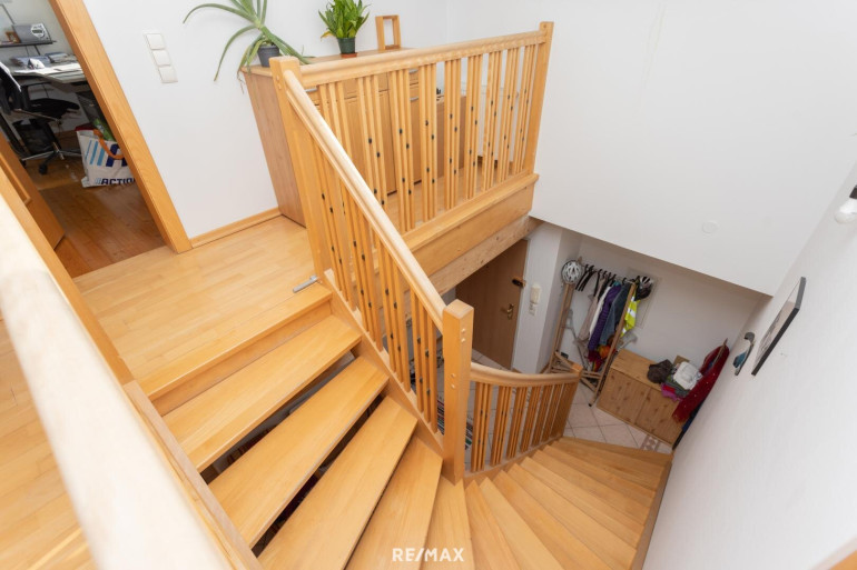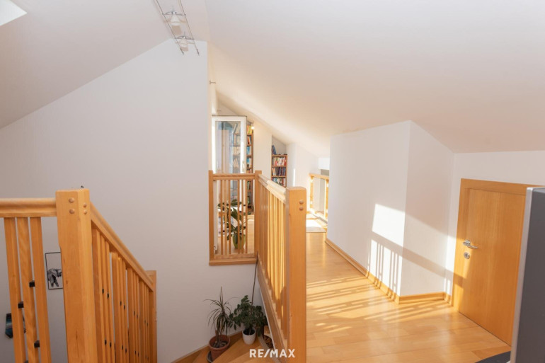 Aus dem Vorraum führt Sie eine Stiege in die 2. DG-Ebene, wo sich ein hof- und terrassenseitiger Raum (ca. 10 m²) mit Fenster befindet, den man auch als Arbeits- oder Gästezimmer nutzen kann, sowie darüber hinaus eine weitere Stauraumfläche. Über die Galerie können Sie die ca. 21 m² große, hofseitige, west-/nord-west-seitige Terrasse betreten.