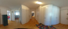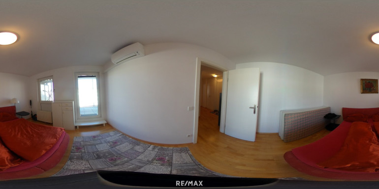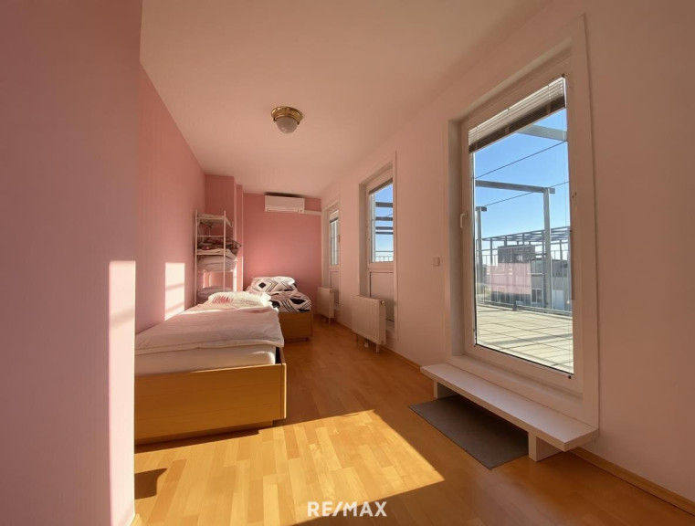 Das zweite ca. 15 m² große Zimmer verfügt über den Zugang zur ca. 10 m² großen Loggia und ist direkt über den Vorraum erreichbar. Die nord-ost-Loggia ist auch mit der größeren Terrasse verbunden.