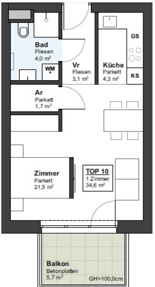 Die im 1. Obergeschoß geplante Wohnung Top 10 (Lift ist vorhanden) mit ca. 34,6 m² Wohnnutzfläche und einem Balkon mit ca. 5,7 m² verfügt über folgende Raumaufteilung: