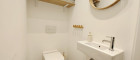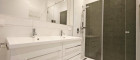 ein modernes Badezimmer mit bodenbündiger Dusche, hochwertiger Armatur und zusätzlicher Duschtüre