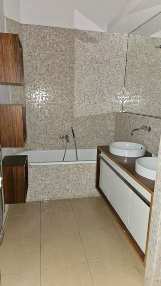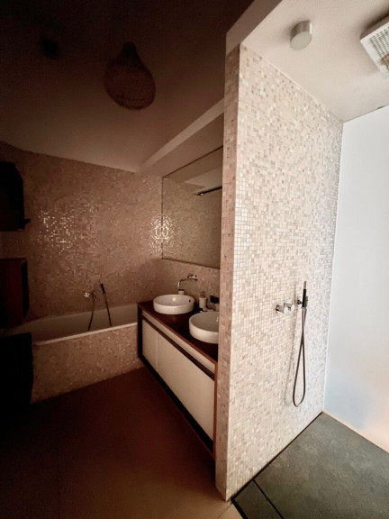 - Modernes Bad mit Doppelwaschbecken, Wanne und Walk-in Dusche.