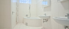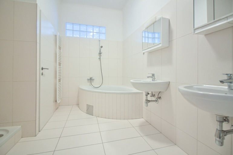 - Badezimmer mit Badewanne, Dusche, 2 Waschtischen und Waschmaschinenanschluss