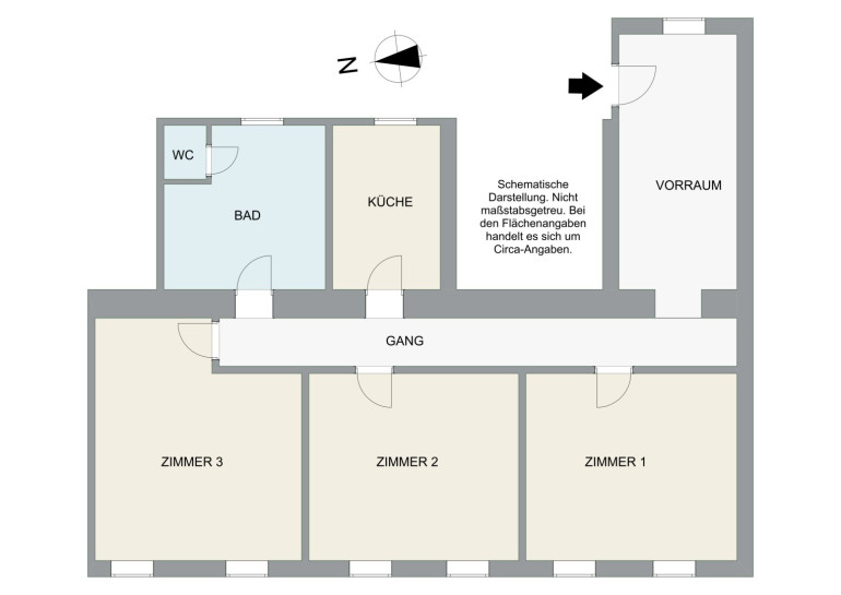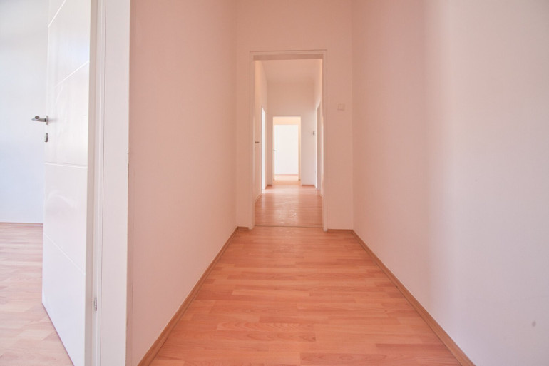 Der Vorraum bietet ausreichend Platz für Garderobe und kann mit seinen über 13 m² auch als Arbeitsraum oder Gemeinschaftsraum bei einer WG-Vermietung genutzt werden. Von hier aus werden alle weiteren Räume über einen Gang erschlossen.