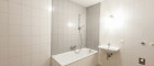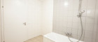 Das Badezimmer ist mit einer Badewanne, einem Waschbecken und einem Waschmaschinenanschluss ausgestattet, während das WC separat angelegt ist.