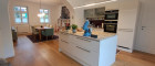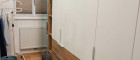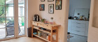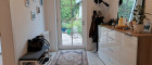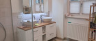 Das Badezimmer ist ebenfalls mit Fenster ausgestattet und verfügt über eine Badewanne, eine bodengleiche Dusche, einen Doppelwaschbecken sowie einen Handtuchtrockner. Vom Wirtschaftsraum besteht ein Ausgang in den Garten.
