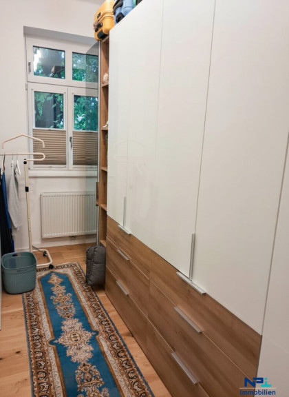 Die Raumaufteilung umfasst einen Vorraum, eine großzügige Wohnküche mit einem schönen historischen funktionstüchtigen Kachelofen, ein Schlafzimmer mit begehbarem Schrankraum sowie eine separate Toilette mit Fenster und Handwaschbecken.