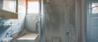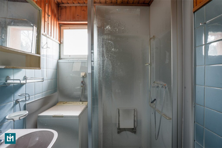 - Badezimmer mit Dusche, Waschmaschinenanschluss und Fenster