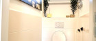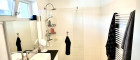 - Badezimmer mit Dusche, Waschbecken, elektrischen Handtuchwärmer und Waschmaschinenanschluss