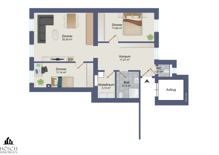 Das Wohnzimmer bildet das Herzstück der Wohnung und lädt zu entspannten Stunden mit Familie und Freunden ein. Die großzügige Wohnküche ist ideal für gemeinsame Kochabende, während die Schlafzimmer ruhige Rückzugsorte bieten. Ein praktischer Abstellraum sorgt für zusätzlichen Stauraum, und das separate WC sowie das moderne Badezimmer mit eleganten Armaturen erhöhen den Wohnkomfort.