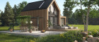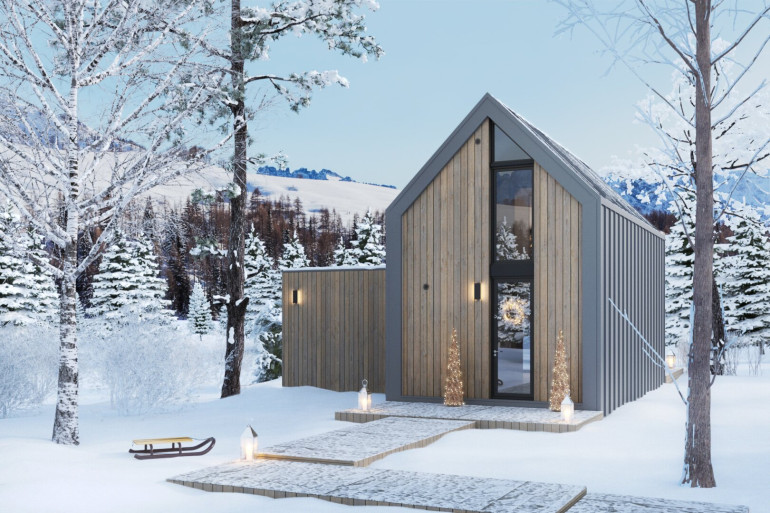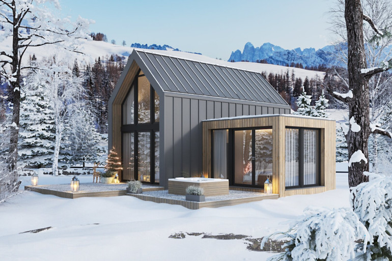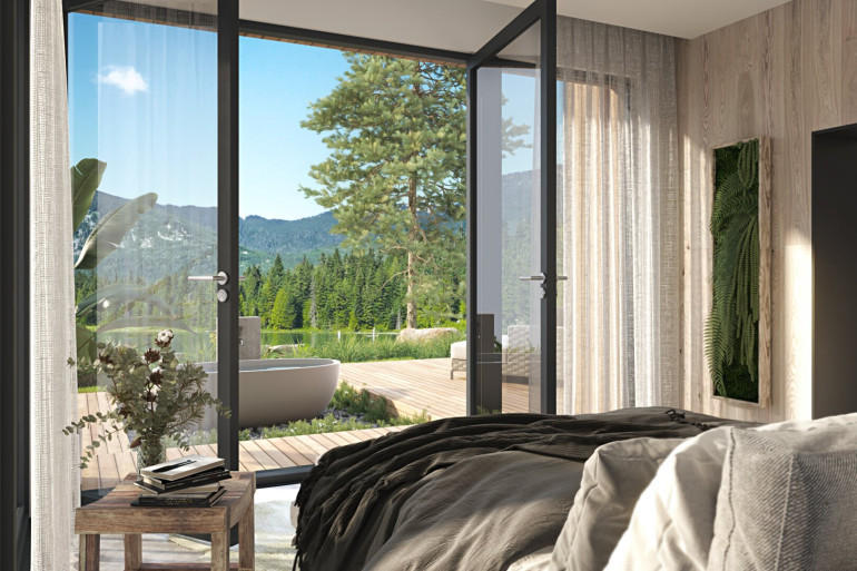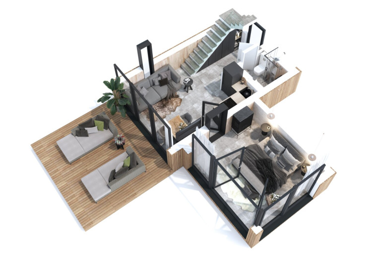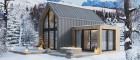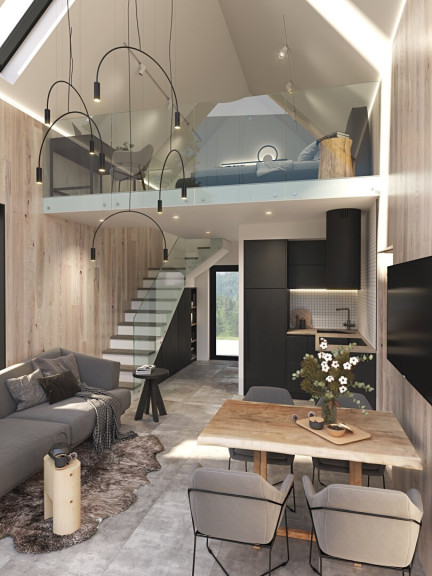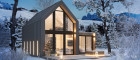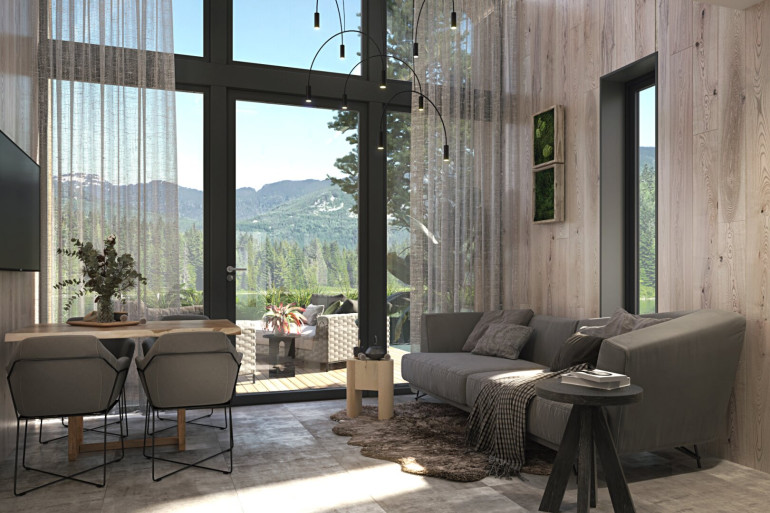 Dieses Modell vereint offenes Wohndesign mit praktischer Flexibilität: Ein lichtdurchfluteter Hauptraum mit großzügiger Verglasung öffnet sich zur Bergwelt und schafft ein einladendes Ambiente. Die großflächigen Glasfronten verbinden Innen und Außen nahtlos – jeder Blick wird zum Naturerlebnis.