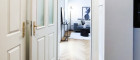 Eine verglaste Tür verbindet das Schlafzimmer mit dem Balkon und sorgt gleichzeitig für ein helles und freundliches Wohnambiente.