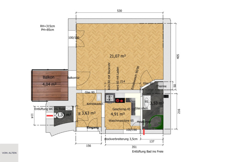 Vom Vorzimmer aus gelangen Sie direkt in das Badezimmer, während die separate Toilette ebenfalls vom Eingangsbereich erreichbar ist. Das Entrée führt zudem in die Küche, die mit einer Einbauküche sowie einem Waschmaschinenanschluss ausgestattet ist, und weiter in das Schlafzimmer. Im gesamten Wohnbereich wurde Parkettboden verlegt.
