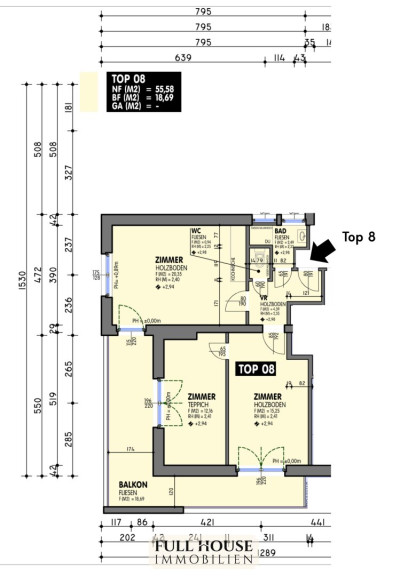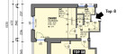 Man betritt die Wohnung über einen zentralen Vorraum (ca.4,39 m²), von dem aus alle Räume direkt zugänglich sind. Rechts liegen das separate WC (ca.1 m²) sowie das Badezimmer mit Dusche (ca. 2,49 m²), beide funktional gestaltet und praktisch angeordnet.