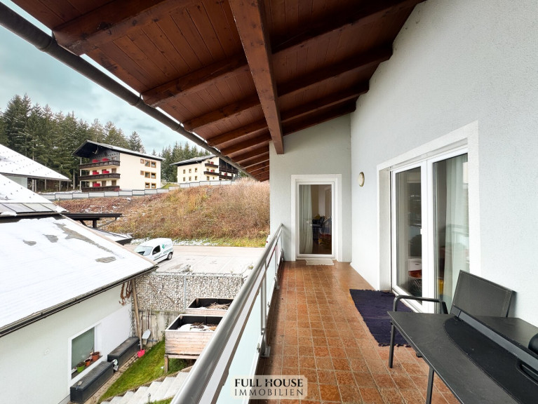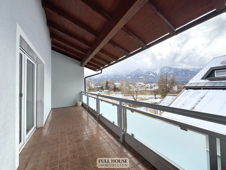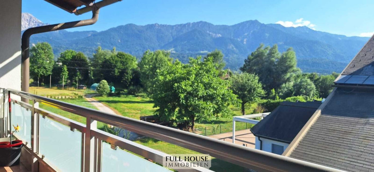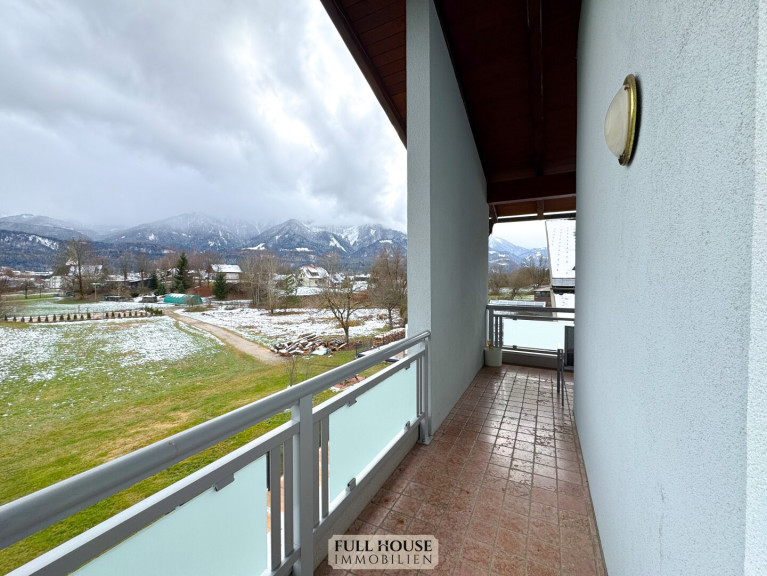 Geradeaus eröffnet sich der größte Raum der Wohnung: ein lichtdurchfluteter Wohnbereich mit ca. 20,35 m², mit direktem Zugang auf den sonnigen Balkon (ca. 18,69 m²). Dieser bietet durch seine Größe reichlich Platz für einen Essbereich, Lounge-Möbel oder Pflanzen – ideal, um die Nähe zum Faaker See zu genießen.