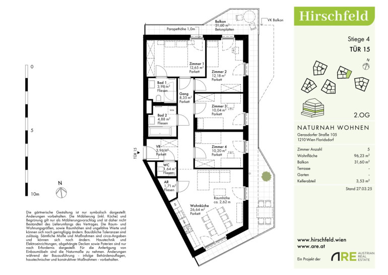 - Hochwertige Ausstattung: Fußbodenheizung bzw. Fußbodenkühlung (Temperierung), 3-Scheiben-Isolierverglasung, Parkettboden, Feinsteinzeugfliesen uvm.