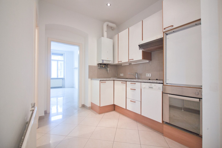 Der verlängerte Vorraum verfügt über eine separate Küche und erschließt ein großzügiges Badezimmer mit Waschtisch, Badewanne, Handtuchheizkörper und Waschmaschinenanschluss sowie ein westseitig und in eine ruhige Seitengasse (Greinergasse) ausgerichtetes, gut geschnittenes Wohnzimmer.