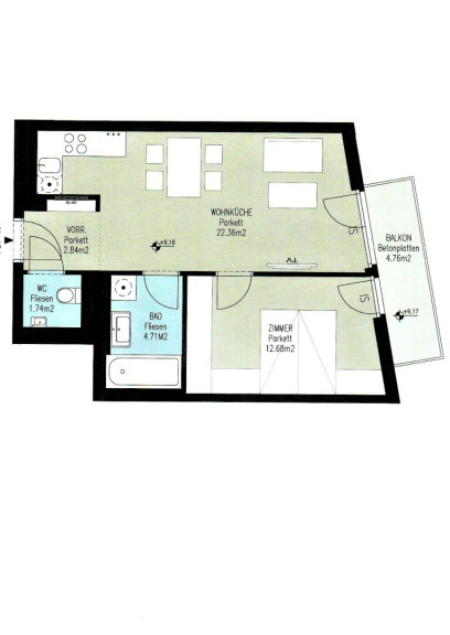 Vorzimmer, Wohn-Esszimmer mit Kochnische, ca. 5 m2 Balkon, Schlafzimmer, Badezimmer, WC + Kellerabteil