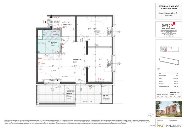 Die Wohnung befindet sich im 7. OG und verfügt über 57,93 m² Wohnfläche + einen 8,32 m² großen Balkon + eine 7,96 m² große Terrasse.