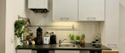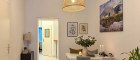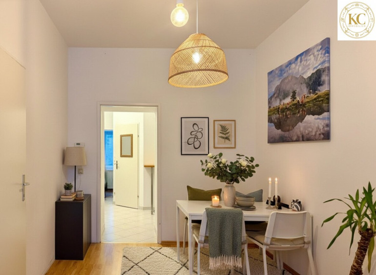 Im Zentrum der Wohnung befindet sich die Küche mit kleiner Bar – ideal für gemeinsames Frühstück oder kurze Gespräche im Alltag. Direkt anschließend befindet sich das Wohnzimmer, das ausreichend Platz für einen Esstisch bietet. Küche und Wohnbereich funktionieren offen und kommunikativ, können aber bei Bedarf getrennt werden.